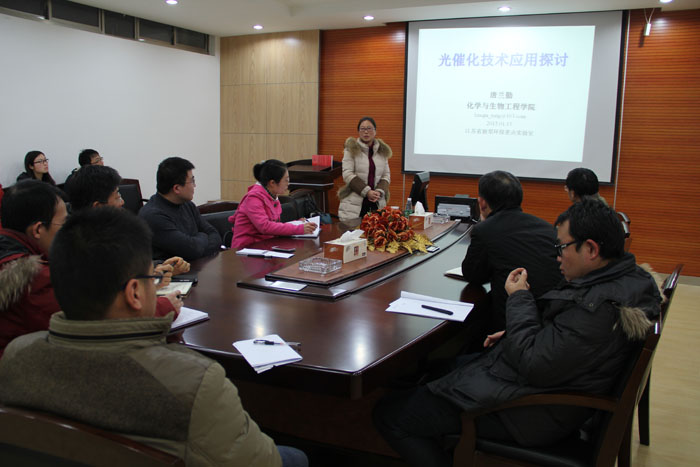 2015年1月15日下午,在东校区知达楼二楼研讨室,化生学院唐兰勤博士走进我室学术沙龙,为我室师生作题为《光催化技术应用探讨》的学术报告。报告会由实验室张勤芳教授主持,相关老师及众多研究生参加了交流会。