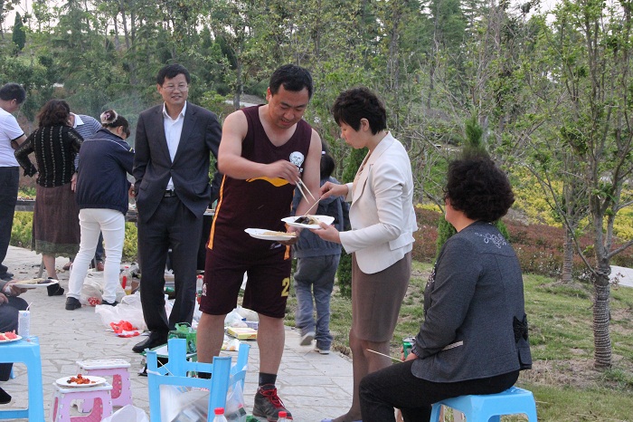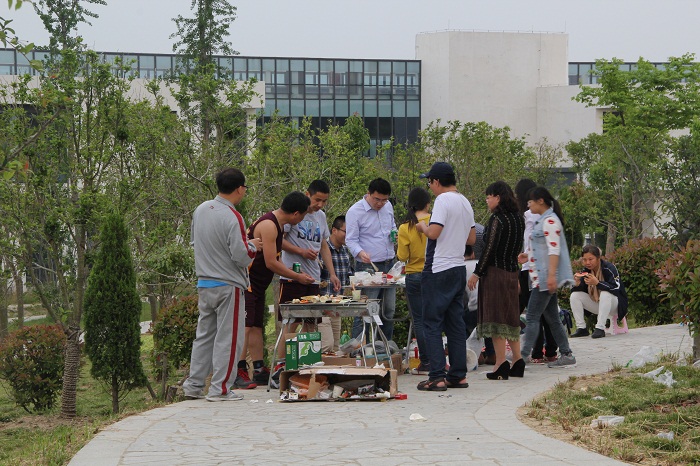 本次活动,在实验室老师及众多研究生的精心组织下,一下午的时间大家过的充实而愉快,丝毫没有疲惫之感。来到樱花园,大家先在丛林深处、绿茵之下搭起帐篷,燃起炭火小炉,铺好桌布进行着一切准备工作。吹着轻轻小风,欣赏着碧水蓝天的迷人景色,大家围着炭火炉一圈,卷起袖子,大手一挥孜然辣椒面儿往肉上一洒,滋啦啦的声音立马传来,马上阵阵的肉香跟着就来,口水也跟着来了!等不及下一波烤好,这波立马就被分光,手慢点就吃不上了!烧烤就是件备具战斗力的活儿!在这里,小孩们三五成群地奔跑,在大自然中探秘,大人们忘却了生活中的压力与烦恼,尽情享受着这美好的快乐时光。