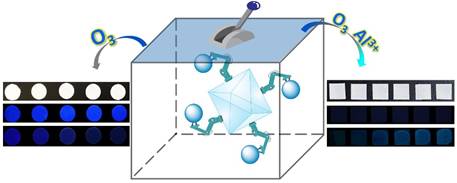 臭氧具有分布广泛、危害大等特点,发现新的臭氧探测技术具有迫切的科学意义及现实需求。现有臭氧探针技术面临设备复杂、抗干扰能力差等缺陷,依赖单一检测原理难以成功构建理想的臭氧探针技术。该论文报道了一种基于组合式原理的新型MOF双功能探针的设计及其对臭氧和Al3+的特异性传感应用研究。为了从根本上提升对臭氧的选择性,以末端烯烃臭氧化为检测原理,借助进一步的β消除反应,实现了MOF孔道内位阻的显著变化,借助该过程导致的AIE效应的消失,实现了基于荧光猝灭的选择性臭氧识别,其检测限低至73 nM。进一步地,经臭氧处理过的MOF探针暴露出预埋的席夫碱位点,可以用来建立对Al3+的特异性识别,通过重新恢复AIE效应实现了基于荧光增强的选择性Al3+线性检测,检测限低至142 nM。此外,该复合探针材料具有令人期待的应用前景,能够以检测试纸的形式方便应用到多种实际环境中,充分展现了理想的材料设计对于应用的提升推动作用。