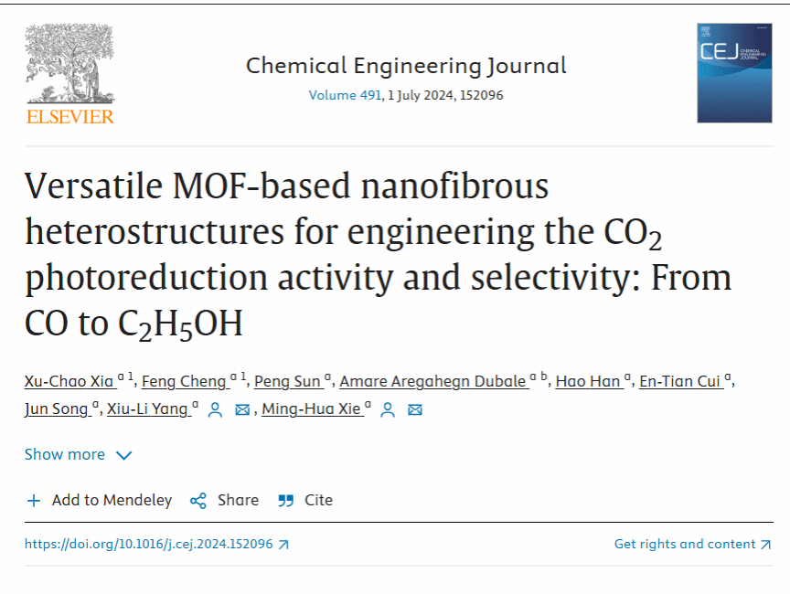 近日,以盐城工学院硕士研究生夏许超同学以第一作者,我室解明华及杨秀丽教授为通讯作者,盐城工学院为唯一通讯单位,在化工领域TOP期刊《Chemical Engineering Journal》发表题为“Versatile MOF-based nanofibrous heterostructures for engineering the CO2 photoreduction activity and selectivity: from CO to C2H5OH”的研究成果。《Chemical Engineering Journal》是工程技术与化学化工领域最有影响力的三大顶级刊物之一,其主要目的是及时快速地报道工程领域化学反应工程、环境化学工程及材料合成应用等方面重要的科学研究成果和创新技术,中科院一区,影响因子为15.1(论文链接:https://doi.org/10.1016/j.cej.2024.152096)。
